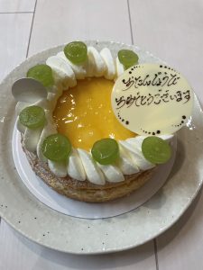 スタッフのみんなが私のために、新規開業したケーキ屋さんで私の大好きなcheese cakeを wholeで買ってきてくれました。